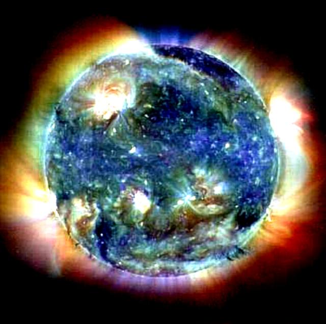 Цветное изображение Солнца. Соединяя изображения в различных длинах волны можно создать псевдо цветное изображение Солнца. Яркие области - области солнечной активности. Они видимы вокруг Солнца и эквивалентны тропическим широтам на Земле. Эти яркие пятна соответствовали бы размещению солнечных пятен видимых с Земли, Видно, что-вся звезда покрыта титановыми шарами.