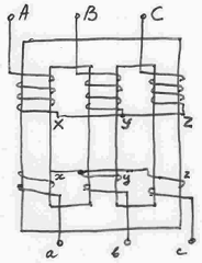 Подходит трехфазный ток (три провода) на 7-33 киловольта. Если ничего эдакого в доме не нужно (три фазы, высоковольтная зарядка для электромобиля и тд), то отходит однофазный с такого вот трансформатора. Извиняюсь за корявый рисунок.