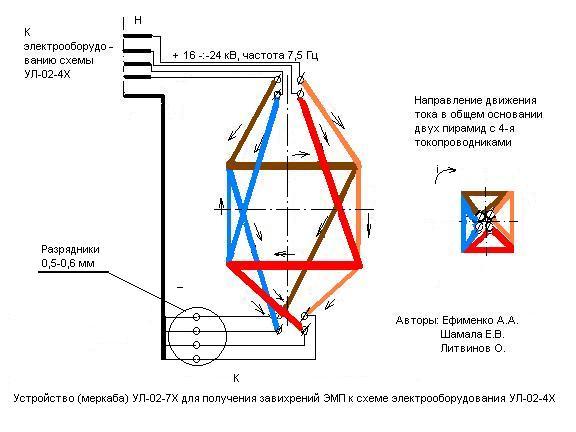dmdimon, спасибо за внимание. С помехами мне всё ясно. Спирали(катушки) натянуты по линиям рёбр двух пирамид, обращенных основаниями друг к другу,а вершинами - по магнитным полюсам. Ожидаю в области оснований диаметром 1 м  ЭМГ вихревые колебания, заданной частотой, в данном случае 7,5 Гц. Кроме того, спирали будут создовать реактивное сопротивление и тепло от их нагрева явится предпосылкой для перемещения воздуха через верхнее и нижнее отверстия лёгкого алюминиевого корпуса, в которые установлены стационарные лопости. При этом, корпус через разрядник 0,5 мм подключён к минусу и покрыт пенополиуретаном для термоизоляции. Плюс от прерывателя, конденсатора и катушки вобуждения (Б117-А) подключён к спиралям (катушкам). Замерятся будут:температура воздуха внутри корпуса, наличие ЭМП, величина воздушного вихря при выходе из отверстий, а также величина подъёмной силы. Цель -установить эмпирическую формулу зависимости подъёмной силы от параметров электофизических величин устройства.73
