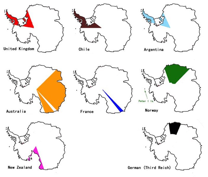 Напротив, территориальные притязания некоторых стран огромны. Например, Норвегия претендует на территорию, превышающую её собственную в десять раз (в том числе на остров Петра I, открытый экспедицией Беллинсгаузена — Лазарева). Огромные территории объявила своими Великобритания. Австралия считает своей почти половину Антарктиды, в которую, впрочем, вклинивается «французская» Земля Адели. Предъявила территориальные претензии и Новая Зеландия. Великобритания, Чили и Аргентина претендуют практически на одну и ту же территорию, включающую Антарктический полуостров и Южные Шетландские острова.