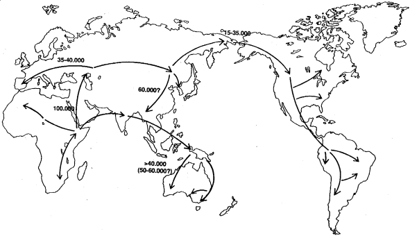 До кучи - предполагаемая карта расселения Homo sapiens sapiens: куда только не носило, нафиг через все климатические и часовые пояса :)