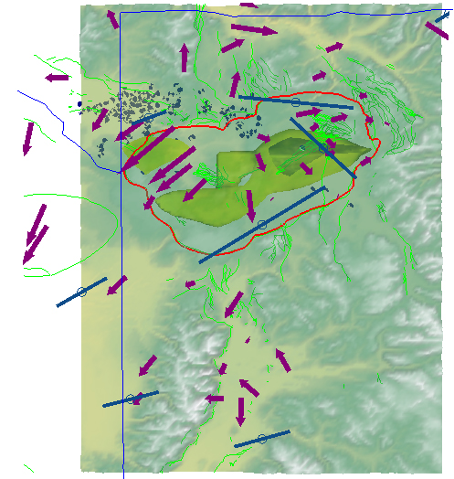 Yellowstone National Park with GPS velocities, caldera outline(red), seismic shear wave tomography isosurface(green), faults, seismic shear wave polarization bars, and colored topo relief map (transparent).