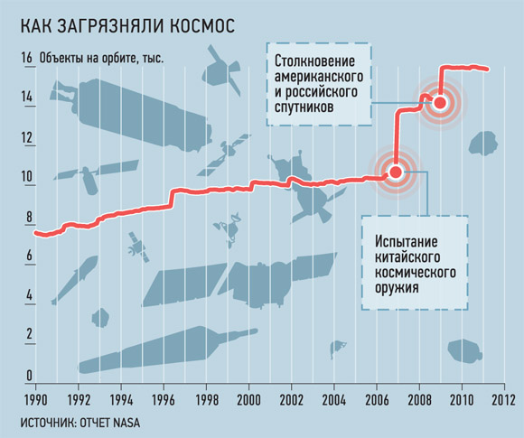 В 2007 году Китай испытал на одном из своих устаревших аппаратов боевую ракету. Обломки разлетелись в виде огромного облака. А в 2009 году мусора снова прибавилось. На орбите столкнулись два спутника — российский «Космос-2251» и американский «Iridium 33».