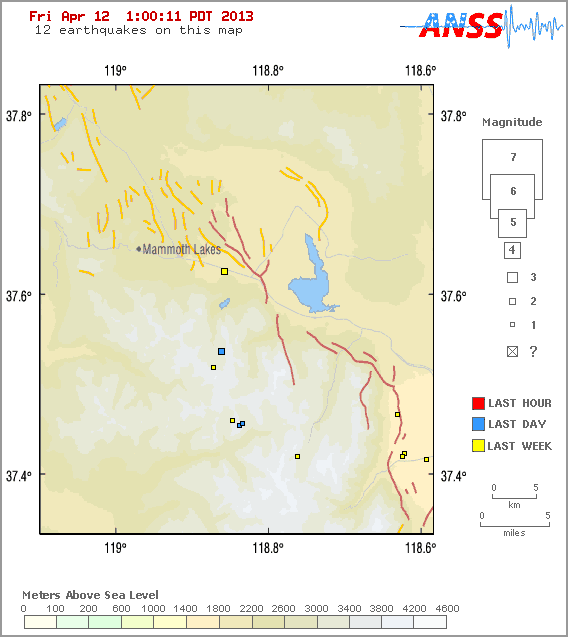 ЦитироватьLong Valley Caldera – While the East Coast recovers from earthquake jitters, small quakes have been rocking California. A minor jolt struck the San Francisco Bay area Wednesday at 9:57 a.m., just hours after a similar temblor hit the same spot late Tuesday night. The U.S. Geological Survey says both magnitude- 3.6 quakes were centered about six miles southeast of Oakland along the Hayward fault, a major Northern California fault zone. The Sierra Nevada high country was also rattled by an earthquake early Wednesday. The USGS says a magnitude- 4.4 quake hit at 4:59 a.m. about nine miles southeast of Mammoth Lakes. A Mono County sheriff's dispatcher says authorities have had no reports of damage. A magnitude-5.8 quake jolted much of the eastern United States on Tuesday.