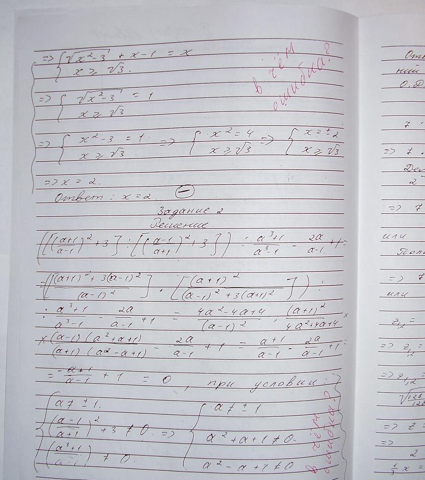 ЦитироватьВсе ошибки вам заботливо подчеркнули. В первом задании х >= 0 - неверно. Правильно  x >= 1/2. Во втором задании из трех условий два лишние. Нужно только первое условие: a <> +-1. Ответы у вас правильные, ну и что? Ошибки в ходе решения все равно есть. Вам же не два а три поставили.