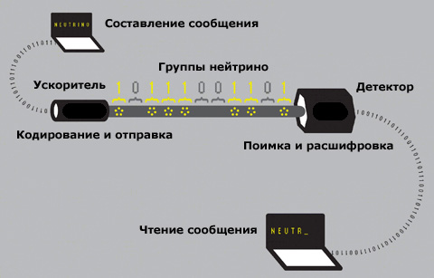 Учёные закодировали слово «neutrino» двоичным кодом, в котором единице соответствовала посылка большой группы нейтрино, а нулю – пауза в нейтринном луче.