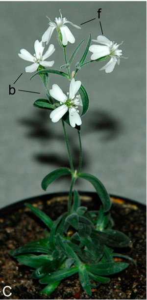 Смолёвка узколистная, выращенная из тканей древних семян: f — женские цветки, b — двуполые цветки с пестиками и тычинками. Современные смолёвки этого вида имеют только обоеполые цветы: это различие указывает на разницу в условиях, сопровождающих цветение. Изображение из обсуждаемой статьи в PNAS