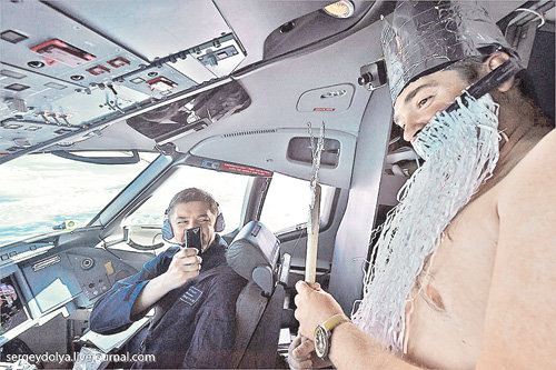 Экипаж и пассажиры отмечают пересечение экватора. Видимо, доступ в кабину пилотов был открыт. В костюме Нептуна (хотя так положено по морской традиции) - блогер Сергей Доля. На мобильный телефон его фотографирует второй пилот Александр Кочетков.