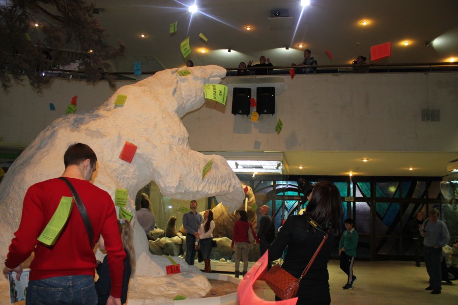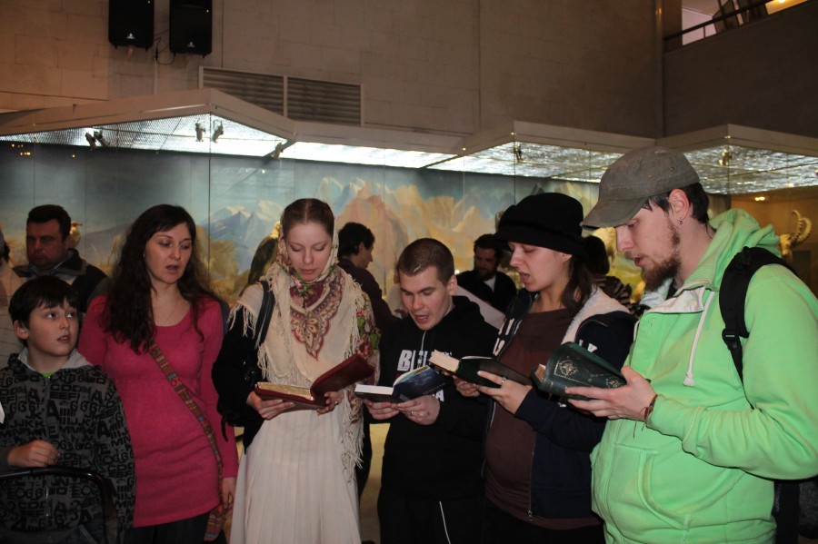 В зале экспозиции "Многообразие жизни на земле" родители с детьми неспешно прогуливались, рассматривая экспонаты животных, как неожиданно со второго этажа громко прозвенел колокол, и после удара колокола сначало маленькая девочка, в футболке с надписью "Я знаю, что мир создан Богом 7522 года назад", а потом и группа молодых людей начала читать нараспев I главу из книги Бытия: "В начале Бог сотворил небо и землю...".