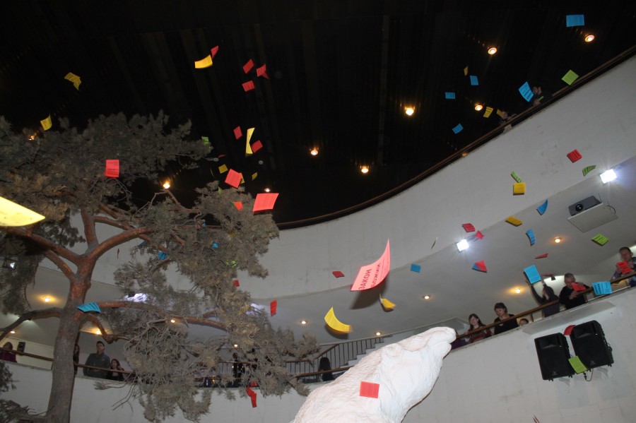 В это же время на глазах у изумленной публики со второго этажа дождем посыпались разноцветные листовки, в которых был раскрыт псевдонаучный миф "Теория эволюции".