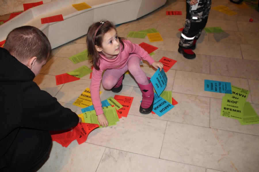 На лестнице музея на вопрос одного из детей о сути праздника, отец спокойно рассуждал, что есть разные люди, те которые верят что мир создан Богом и те которые думают, что он создан Дарвином...