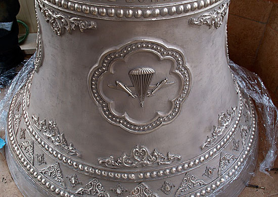 По его словам, впервые церковные колокола при отливке, помимо изображений святых, были украшены десантными эмблемами и символикой Вооруженных сил РФ.