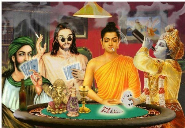 Кто это третий слева? На Заратустру не похож, Заратустра с бородой был. Птааг, что-ли? Но все равно еще одно доказательство, что христианство - верная религия. Будда бухает и карты показывает. А все подглядывают! Пророк, хотя и спрятал карты, но видно, что подглядывать пытается. Иисус техничнее всех, карты грамотно держит, очки темные - блефовать удобно и направление взгляда можно спрятать.