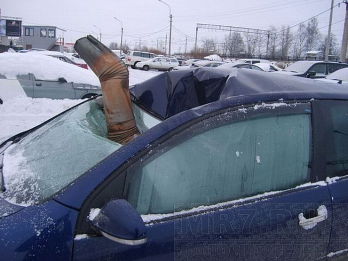 Столб упал Фонарь освещения (размером с задницу) отскочил от дороги и влетел в лобовое. Наверняка можно прочитать показания водилы. Там слева внизу от машины, размером с задницу, фонарь от столба?