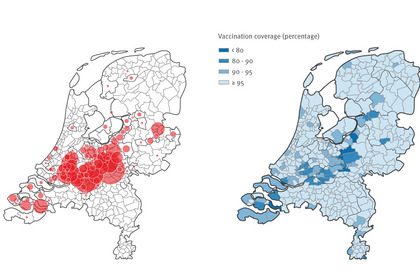 Случаи кори (слева) и доля невакцинированного населения в Нидерландах
