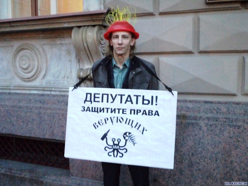 Последователь церкви летающего макаронного монстра отпикетировал петербургский ЗакС. Вышел в священный для него день - пятницу - к зданию петербургского парламента с требованием к депутатам - защитить чувства верующих.