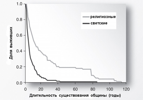Интересные результаты дал сравнительный анализ разнообразных замкнутых коммун и общин, которых очень много возникло в США в XIX веке. Среди них были как религиозные, так и светские (например, основанные на идеях коммунизма). Оказалось, что религиозные общины в среднем просуществовали гораздо дольше, чем светские (см. рисунок). Это хорошо согласуется с идеей о том, что религия способствует просоциальному поведению (верности общине, готовности жертвовать личными интересами ради общества). Более детальный анализ показал, что выживаемость религиозных (но не светских) общин напрямую зависит от строгости устава. Чем больше ограничений накладывала община на своих членов, чем более «дорогостоящие» ритуалы им приходилось выполнять, тем дольше просуществовала община. Это исследование, как и ряд других, указывает на то, что изнурительные обряды, посты и тому подобное, во-первых, являются эффективными средствами убеждения окружающих в собственной лояльности (и поэтому община со строгим уставом надежно защищена от притворщиков и нахлебников), во-вторых, ритуалы служат постоянным напоминанием о божественном присутствии, снижая тем самым «анонимность» ситуации. Любопытно, что после внесения поправок на число «дорогостоящих» ритуалов выживаемость светских и религиозных общин статистически перестала различаться. Это означает, что именно ритуалы и ограничения, а не какие-то другие аспекты религии, играют главную роль в обеспечении устойчивости общины.