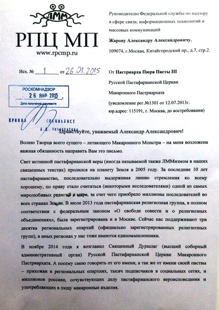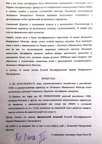 ЦитироватьПока РосКомНаздор выносит предупреждения за публикации фотографий газеты, в которой были карикатуры (http://www.lookatme.ru/mag/live/experience-news/21123..), РПЦ МП официально заявляет: карикатуры на ЛММ и пастафарианство публиковать можно и нужно.