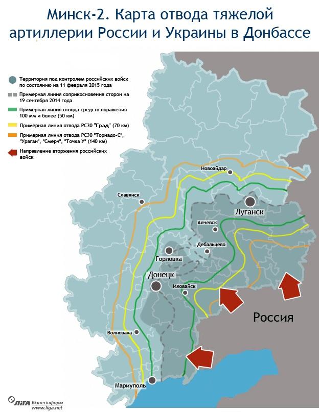 2. Отвод всех тяжелых вооружений обеими сторонами на равные расстояния в целях создания зоны безопасности шириной минимум 50 км друг от друга для артиллерийских систем калибром 100 мм и более, зоны безопасности шириной 70 км для РСЗО и шириной 140 км для РСЗО «Торнадо-С», «Ураган», «Смерч» и тактических ракетных систем «Точка» («Точка У»):