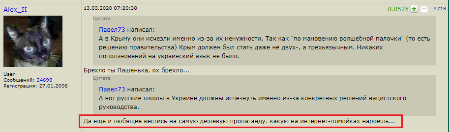 Я вижу вы уверены, что личное мнение не может совпадать с пропагандой. Такая точка зрения вполне обоснована, но Alex II, видимо, ещё не готов её принять.