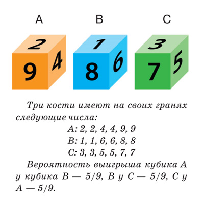 Можем сыграть в кости (см. ниже), противоположные грани которых имеют одинаковые числа. Вы выбираете любую кость, а я всегда выберу одну из оставшихся так, что бы шанс на выигрыш у меня был больше. Вот такие нетранзитивные кости)