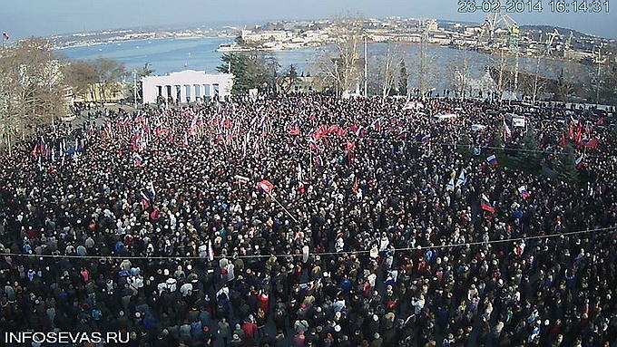 23 февраля в Севастополе состоялся многотысячный митинг горожан, который прошел на площади Нахимова. Столько людей площадь еще не видела никогда. Стояли на парапетах, памятниках, Мемориале героическим защитникам Севастополя. Еще с 14.00 на площадь начали подходить горожане. Стояли и ждали, когда из городского совета выйдут депутаты, которые в это время проводили внеочередную сессию по созданию исполнительного комитета.