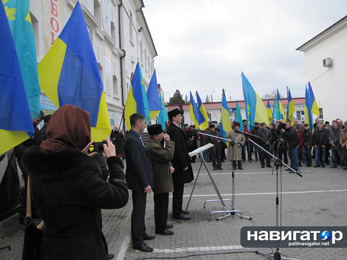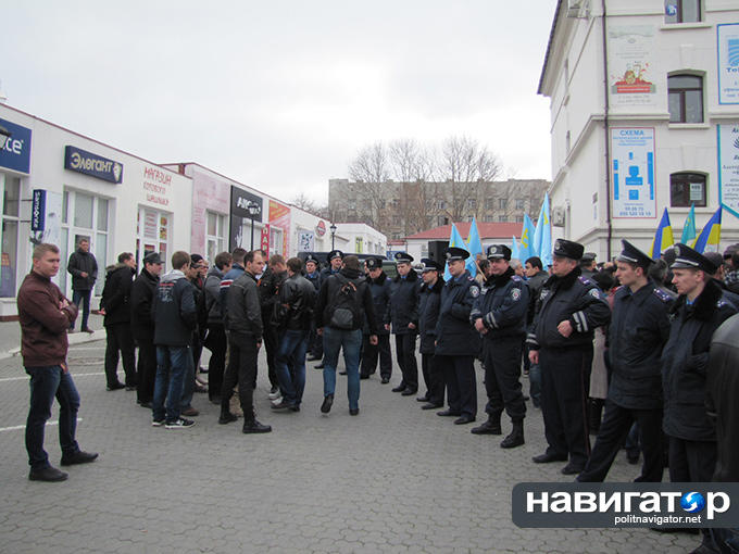 Неподалеку собралась группа молодых людей с георгиевскими ленточками. Они объяснили милиции, что пришли предотвратить провокации. Пока ораторы говорили на крымско-татарском языке или призывали к миру по-русски, наблюдатели реагировали спокойно. Но когда прозвучал лозунг «Слава Украине!», севастопольцы начали скандировать «Россия!». В этот момент их от митингующих отделила милиция.