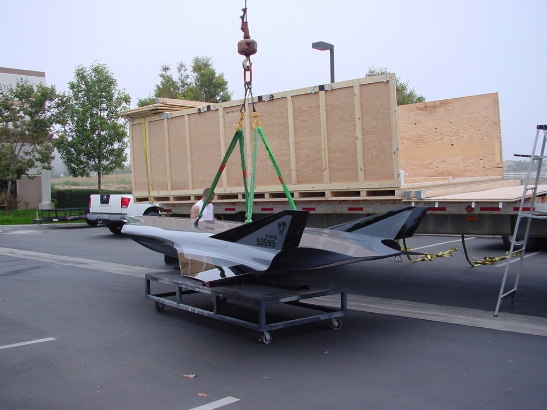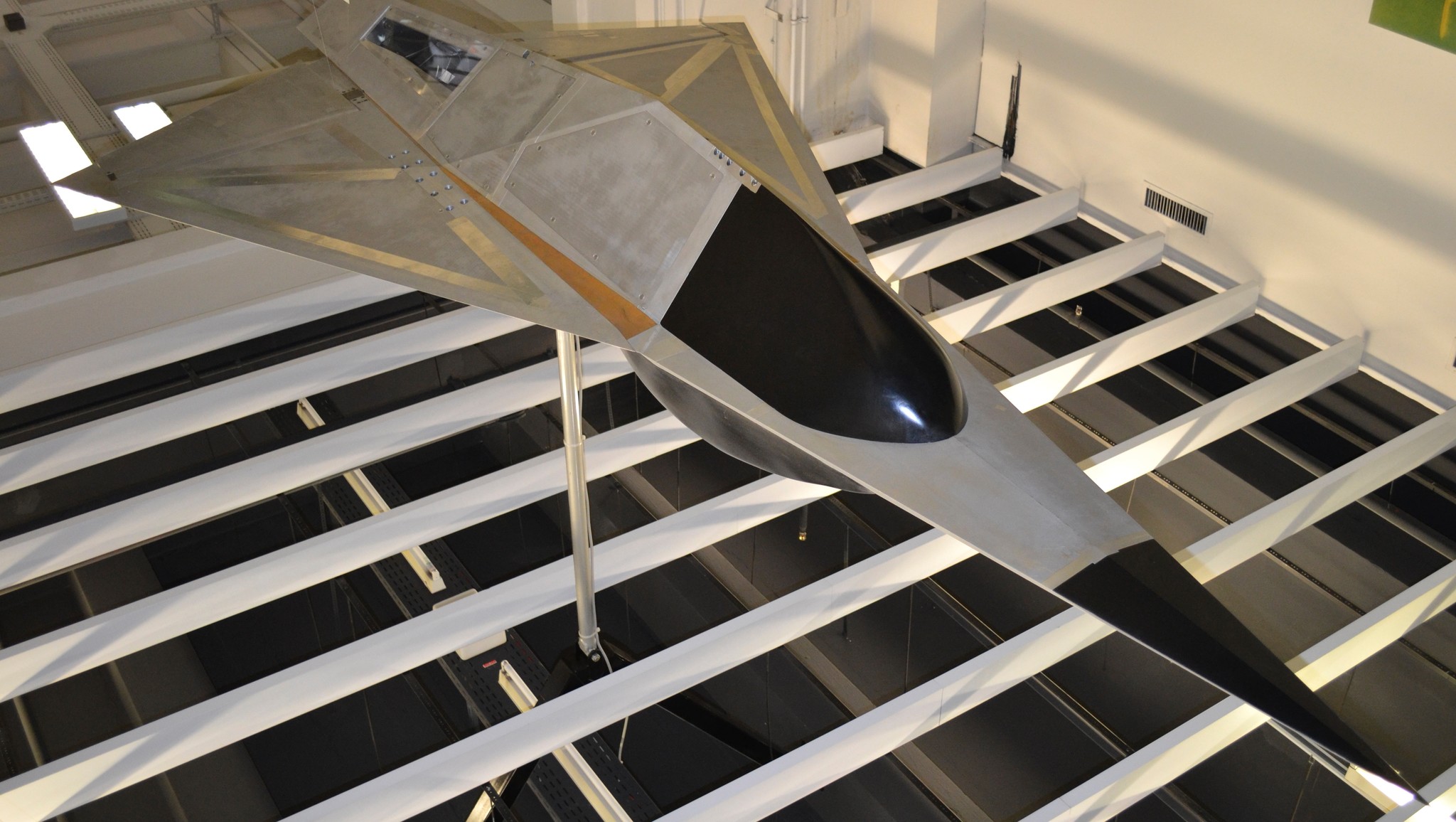 На кафельном полу модельки, справа "стэлс" бомбер В-2, слева какая-то гипотетика.