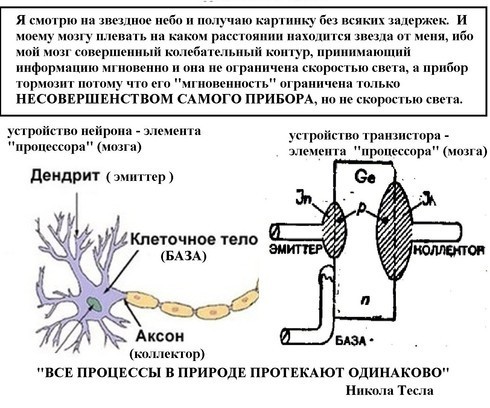 Транзистор, созданный человеком способен видеть и слышать дальше, чем это может делать наш биологический нейрон. Как же так? Где подвох? В данном случае мы упираемся в стену нашего понимания что такое "частота". Что это такое вообще с физической точки? Это количество операций в еденицу времени - и все? Что то маловато как то. Частота должна быть сопряжена с геометрией, т. е. скажем форма сигнала "пила" или "синусоида" - это одно, но формой сигнала может (читающий да разумеет) форма тела человека, или скажем динамическая геометрческая фигура. Что такое синусоида на осцилографе? Это геометрическая микровибрация провода, "вибрация по спирали", опять надо разбираться как может быть "вибрация по спирали". Т. е. у частоты должна быть геометрия, которая эволюционирует... прямая, пила, синусоида,... спиралеконусоида :-)) и далее форма "микроба", или скажем "инфузории туфельки".