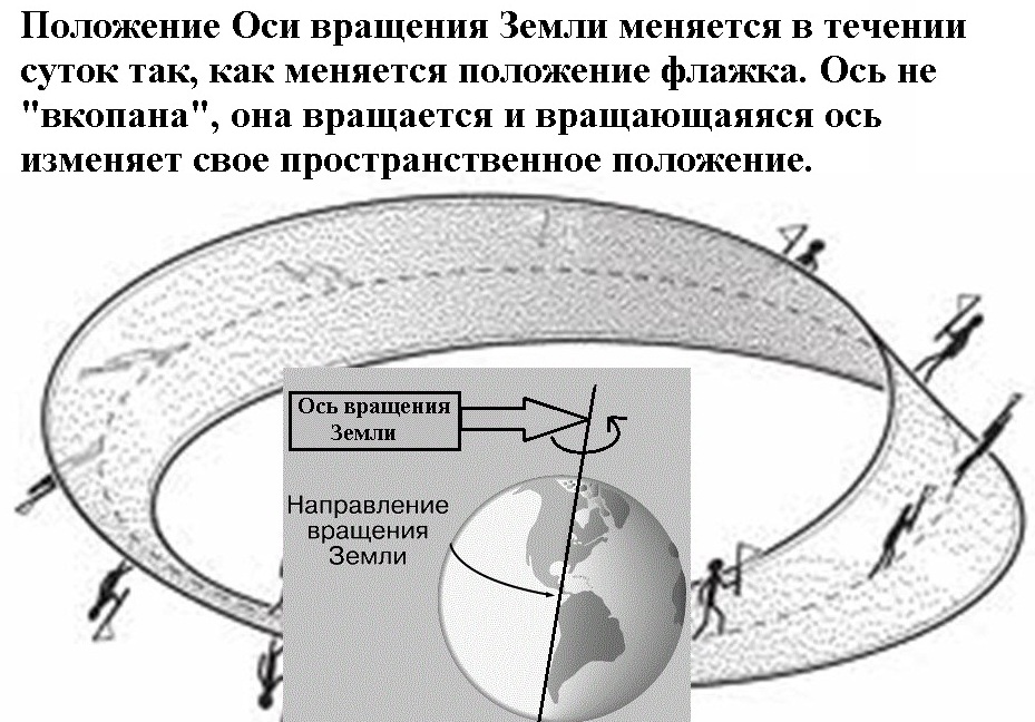 Ось вращения земли "вкопана в Солнце", как ось вращения Луны "вкопана" в Землю, как ось вращения Ивана (потенциального спутника Юпитера кое называют "большое красное пятно" "вкопана" в Юпитер... Вкопана она в том смысле, что она начинается на своем источнике и жестко, повторяю жестко привязаны к своему источнику как арматура карусели, на которой она крутится жестко привязана к самой Земле. Земля вращается вокруг оси, и сама ось также вращается. На МКС проводили опыт. Брали болт и придавали ему вращение. Через 3 секунды болт начинал менять положение своей оси вращения так, как меняется положение флажка на рисунке - по геометрии листа мебиуса. Через 5 секунд северный полюс вращения болта полностью поменялся с южным полюсом. Это назвали эфектом Джанибекова. Частота смены пространственной ориентации объекта в эфекте Джанибекова пропорциональна массе объекта. Болт меняет ориентацию каждые 5 секунд, планета Земля сутки.