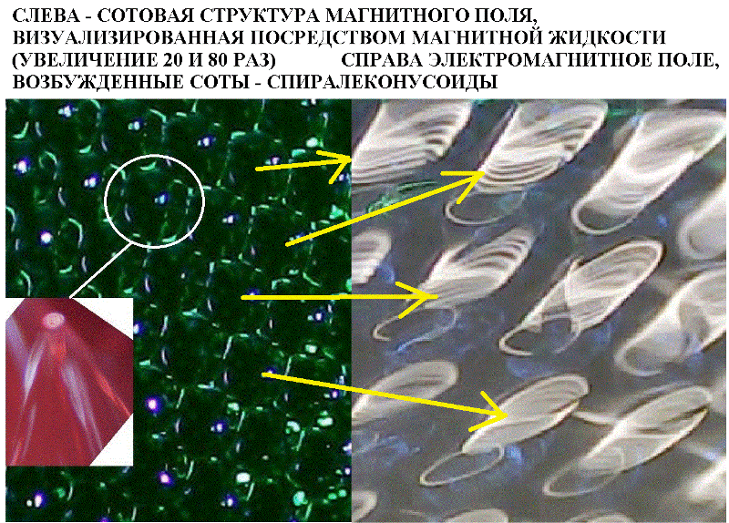 Оборудование он использует, явно не домашнее. Лично у меня нет USB микроскопов на кухне, а магнитную жидкость я никогда не видел. То, что при дуговом разряде заряженные частицы разлетаются ввиде конуса, это так и должно быть, они ведь взаимо отталкиваются, а всякие спирали могут быть из-за вибраций аппаратуры и ее инерционности. Ну, а вообще шестигранные соты образуют не конусы, а шестигранные пирамиды. Так, что это не сптраллоконусы, а пирамидоспираллоконусы. Во, загнул, аж самому занятно.
