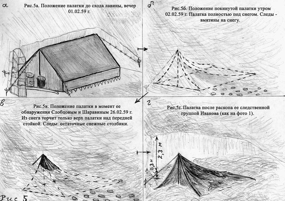 Падение температур в Печоре, Бурмантово и Няксимволе наблюдалось ниже минус 28, - примерно такое же было и на месте аварии. А ветер на открытой части гор был ураганным. Многочисленные свидетели в Вижае отмечали в эти дни необычайно сильные ветра, которые сбивали с ног детей и заметали дороги сдутым из леса снегом. На открытой части гор имела место низовая метель из сдутого снега. Ясно, что такой ветер быстро разрушил след небольшого снежного обвала, который упал на палатку. А одна стойка палатки смогла устоять только потому, что ее плотно придавило метелевым снегом и снегом обвала.