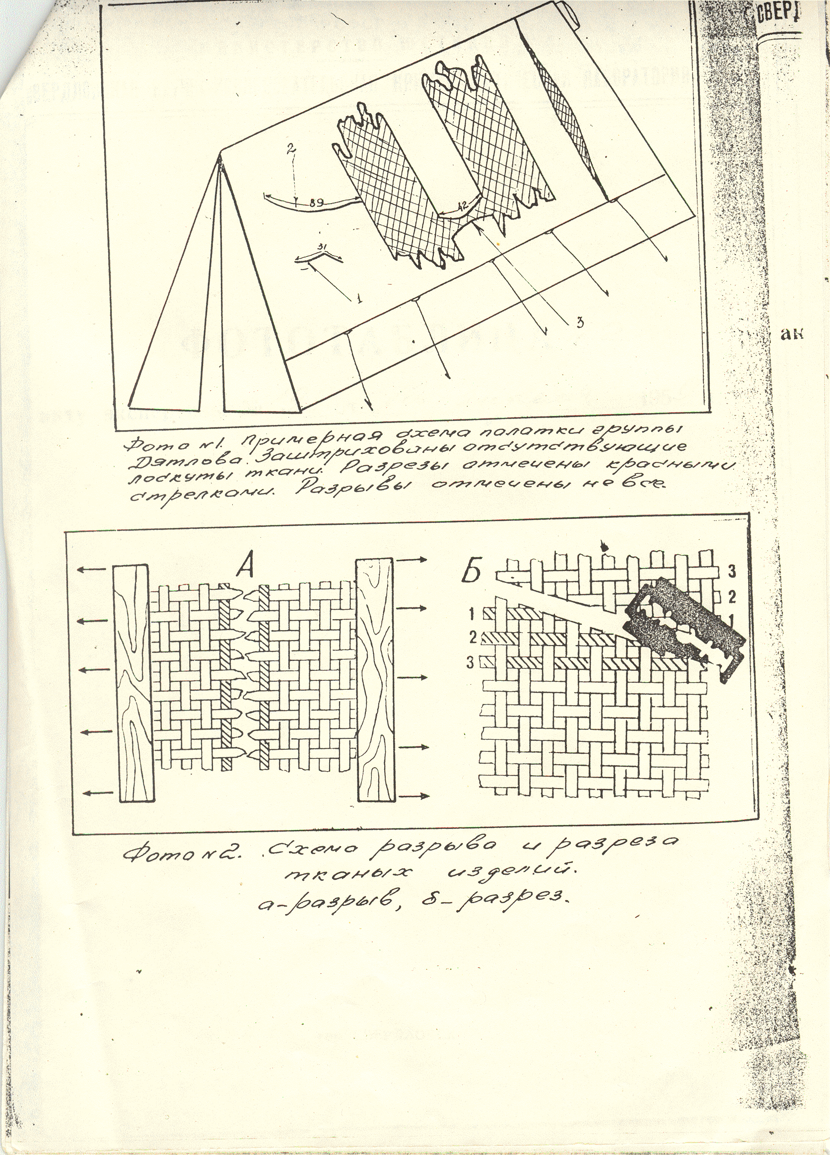 В результате вышеизложенного и при исследовании краев всех, имеющихся на палатке повреждений, можно притти к выводу, что три повреждения /условно помеченные №1, 2, 3/ возникли, как результат воздействия каким-то острым оружием /ножем/, т.е. являются разрезами. Все же остальные повреждения являются разрывами.