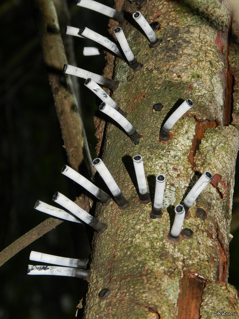 Это вовсе не сигареты, натыканные в дерево, а грибы camillea leprieurii. Растут в амазонских джунглях, типичный размер примерно 30х3 мм, т.е. на сигареты они похожи только на фотографиях, где непонятен масштаб.