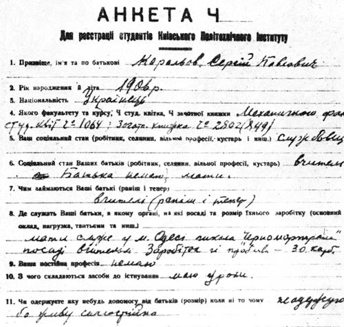 Анкета Королева, когда он учился в Киевском политехе.