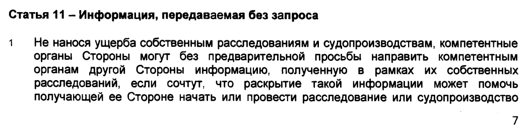 1  Не нанося ущерба собственным расследованиям и судопроизводству, компетентные органы Стороны могут без предварительного запроса направить компетентным органам другой Стороны информацию, полученную в рамках собственных расследований, если сочтут, что раскрытие такой информации может помочь получающей ее Стороне в начале или проведении расследований или судопроизводства или может привести к просьбе Стороны согласно Конвенции или Протоколам к ней.