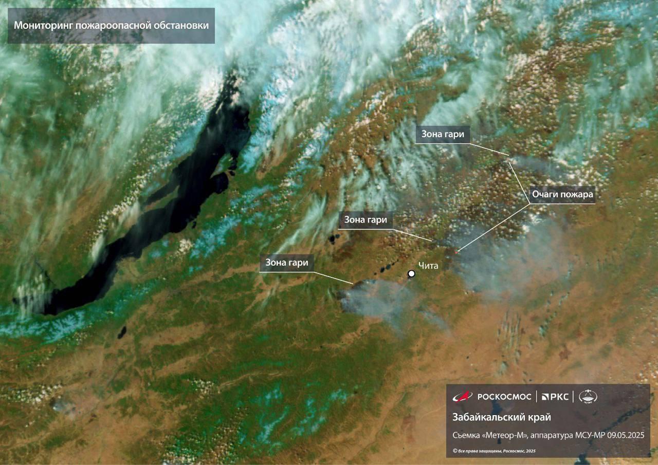 На изображении, полученном с помощью спутника «Метеор-М» и аппаратуры МСУ-МР, можно рассмотреть как зоны активного горения, так и обширные выгоревшие участки вблизи Читы. Кроме того, снимок позволяет увидеть дымовые шлейфы и облачные образования, вызванные пожарами.