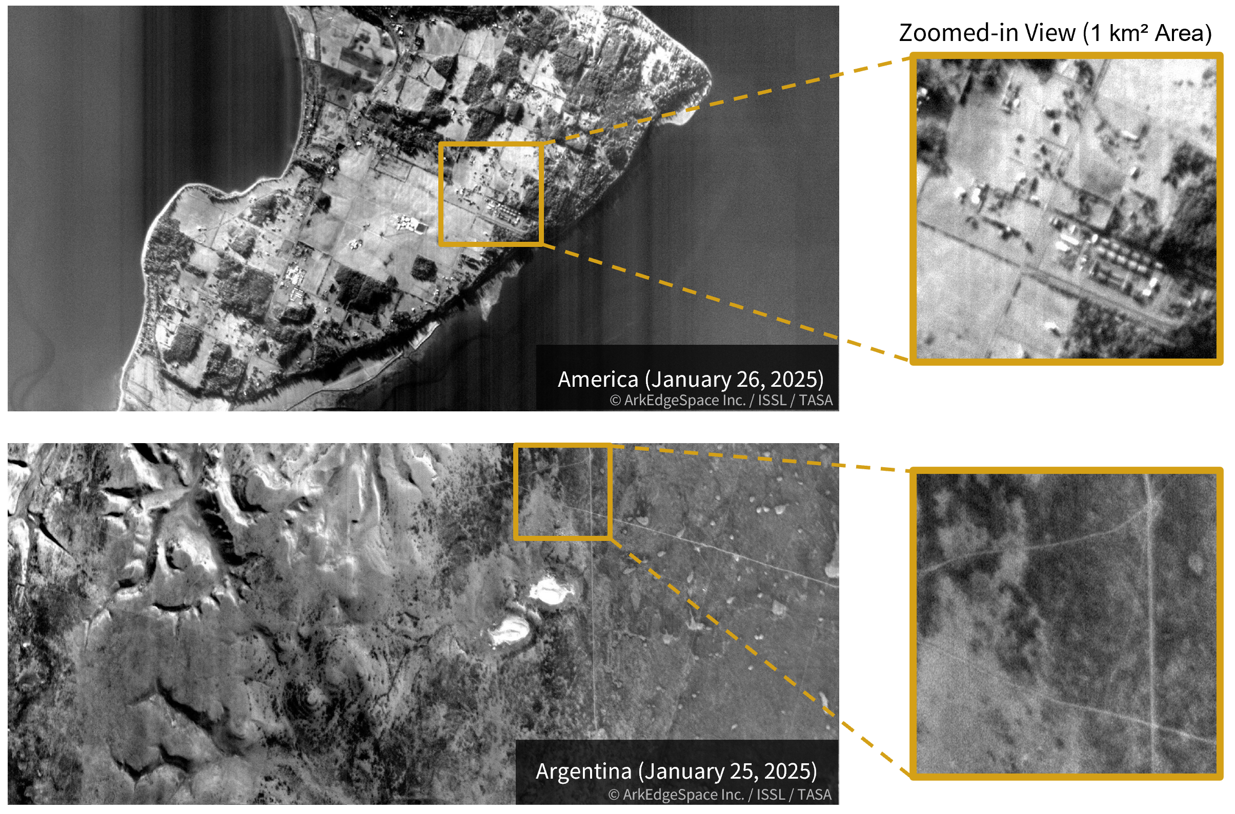 На черно-белых снимках, опубликованных на сайте ArkEdge Space, запечатлены городские пейзажи и дорожные развязки в окрестностях города Сиэтл (США), а также в Патагонии (Аргентина). По данным компании, изображения имеют «самое высокое пространственное разрешение» среди кубсатов — от 2,5 до 3 м. «Снимки получаются такими же четкими, как при аэрофотосъемке, несмотря на то, что они сделаны спутником небольшого размера», — сказал гендиректор ArkEdge Такаеси Фукуйо, слова которого приводит Reuters.