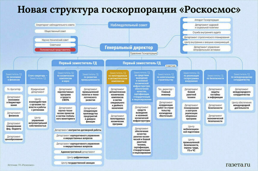С начала августа 2024 года вступил в силу приказ об учреждении новой организационной структуры Роскосмоса, схему которой представила «Газета.Ru».