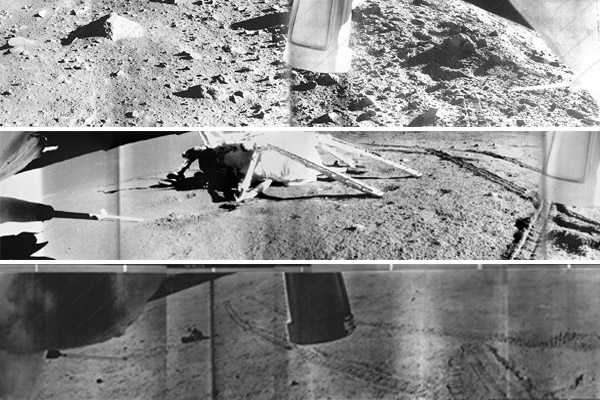 Аппарат немного наклонился в одну сторону, что позволило ему наблюдать своей фотокамерой с одной стороны близкую поверхность Луны, а с другой — её дальний горизонт.