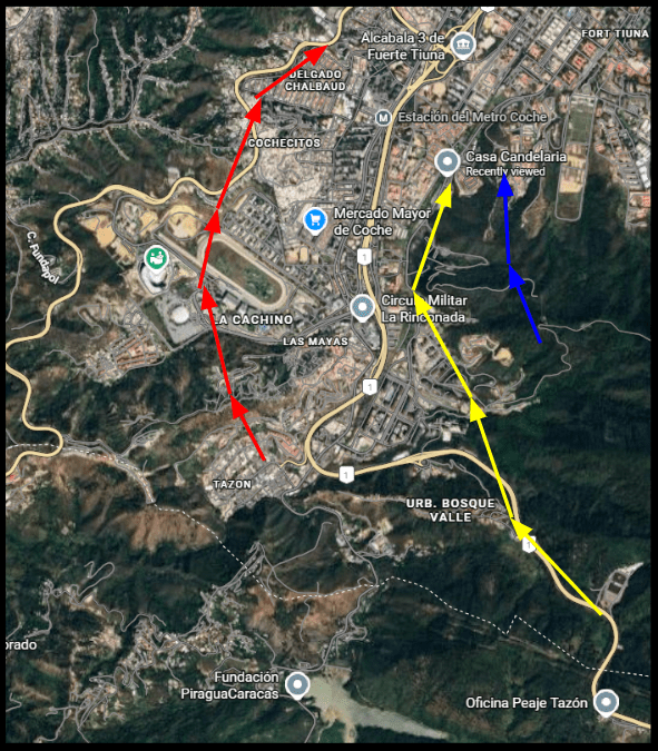 • POV D shows helicopters in formation that appear to be flying along "Troncal 1" south of Caracas. It is unclear whether this is before or after the assault.