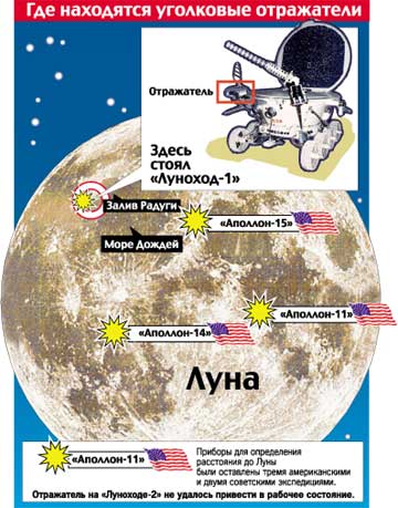 Уголковым отражателем был оснащен «Луноход-1». Так вот, американцы направили на него луч. А ничего не отразилось. Пошарили лучом по поверхности — опять ничего. НАСА — в недоумении. Аппарат словно бы исчез. А ведь координаты его точно известны, пятно луча достигает нескольких километров в диаметре. Промазать трудно.