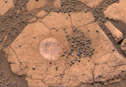 ЦитироватьШтуковина диаметром около 10 сантиметров, похоже, зеркальная - отражает нависший камушек. И то ли обломана, то ли частично засыпана песком. Это позволяет отбросить самое разумное предположение: мол, «диск» представляет собой углубление, сделанное рукой робота. Да, у него есть инструмент - нечто вроде шлифовального круга. Но он меньше и без центрального отверстия.