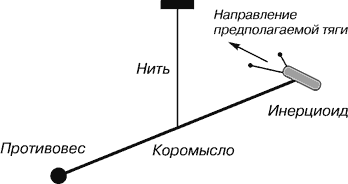 Что же мы получим? Мы получим крутильные весы, очень точный прибор, который способен "почувствовать" малейшую силу тяги. Сопротивления движению - внешних сил - на таких весах почти нет, кроме разве сопротивления воздуха, которое весьма мало при малых скоростях. Проверим точность нашего прибора - тихонько подуем "в спину" инерцоиду. Он начнет медленно крутиться вместе с перекладиной и пройдет достаточно большой путь, пока не остановится. По этому пути можно судить об импульсе тяги.