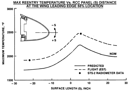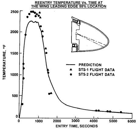 The wing leading-edge temperatures usually reached 2,650 degrees Fahrenheit (1,450 °C) at this point.