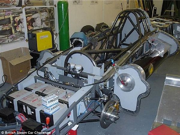 Но настоящим произведением инженерного гения стоит признать силовую установку, которая и будет разгонять автомобиль до рекордной скорости. Основой парового двигателя являются двенадцать бойлеров, работающих на сжиженном газе, и тепловая мощность которых составляет три мегаватта. Рабочая температура внутри нагревателей составляет 400 градусов по шкале Цельсия, и за минуту бойлеры способны превратить в пар до 50 литров дистиллированной воды. Внутри системы создается столь высокое давление, что водяной пар разгоняется до скорости, вдвое превышающей скорость звука, и вращает турбину автомобиля.