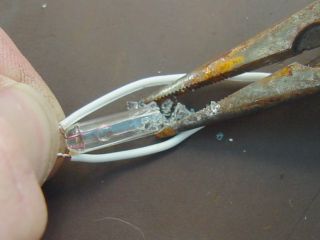 Так выглядит конструкция лампочки. Видно вольфрам паяется не сильно лучше нихрома  :)