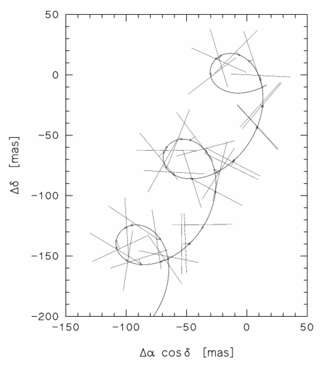 Это немного примитивизированная схема. Последние достижения технологии выглядят примерно так. Запускается спутник (например, Hipparcos), который летает несколько лет и очень точно отслеживает положение каждой звезды.